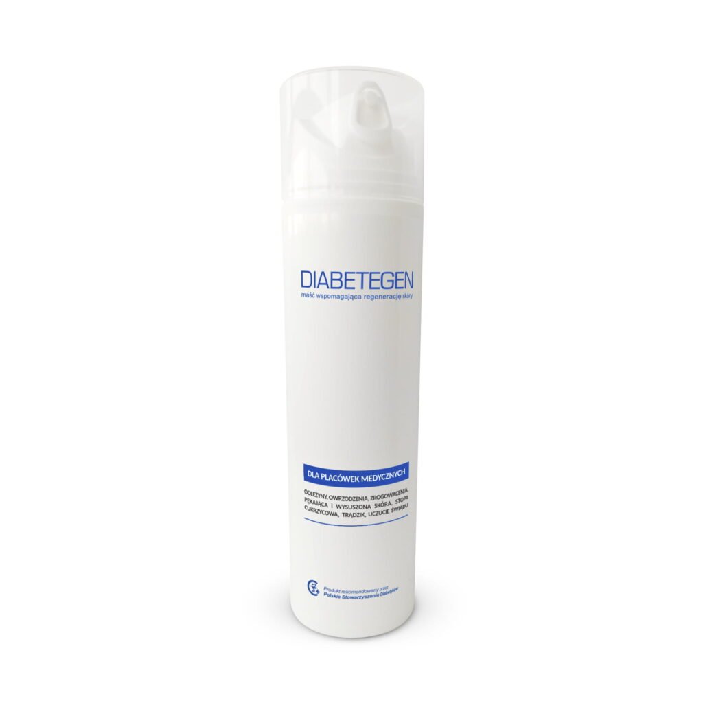 DIABETEGEN – a cream for tissue regeneration – a new generation of dermo-cosmetics supporting tissue regeneration. Thanks to a high content of lactoferrin, lactoperoxidase and colloidal silver, it is excellent in the purification of the background, adjusts the bacteriostatic environment and has a strong germicidal impact. A high content of growth factors stimulates the development of new tissue. Additional components such as allantoin, Panthenol and vitamin E support the healing process and alleviate inflammatory lesions. The cream is recommended by the Polish Association of Diabetics and the Polish Podology Association. The winner of the 1st place at the Diabetica Expo 2011 fair in the category of “Cosmetics”. Properties of the cream: helps in the healing of wounds and skin regeneration, restores the correct pH value of the skin (cream pH 5.78), has the bacteriostatic and germicidal impact, alleviates irritation, reduces skin itching, checks the epidermal keratosis.